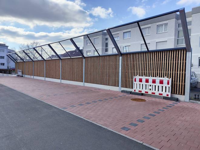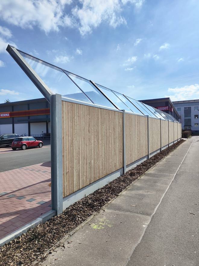einseitig hochabsorbierendes Lärchenholz mit Vordach aus Glas 29,70 lfm x 2,70 m Höhe + 2,12 m schräg (mit Vordach) = 143,15 m²